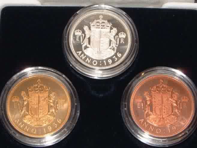 | Edward VIII Pattern Set.Set of 3 proof crowns in the following metals Silver,Copper,Bronze privately issued pieces were made to show what Edward VIII’s coinage might have looked like, if he hadn’t abdicated. Obv Crowned Bust. All Proof in box of issue |