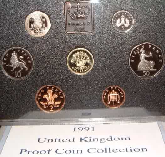 | 1991 Proof Set. (Currency) £1 Flax Plant Northern Ireland,50p,20p,10p,5p Large Type last year of issue & 5p New small type first year of issue,2p,1p.Blue case of issue & COA |