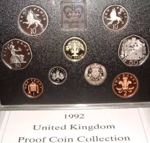 | 1992 Proof Set. (Currency) £1 Oak Tree England,50p General issue,50p Britain's Presidency Council of Ministers & Single European Market 20th anniversary of Britain's entry into the EEC.20p, 10p 1st & Last Year of issue of the Old Ten Pence Size 28.5mm and the New Smaller 10 Pence 24.5mm,5p,2p,1p.Blue case of issue with COA |